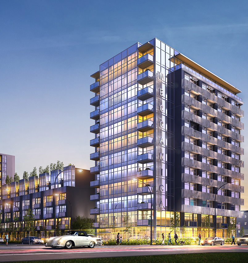 MECCANICA is a residential complex with an industrial component at the base, located at East 1st Avenue and Quebec, in the Southeast False Creek community of Vancouver. 170 thoughtful homes are spread throughout the tower situated at the corner of the block, and a five and a half storey wing building. The two components are joined by a 4-storey high glass enclosed bridge over a breezeway. This project reflects the neighbourhood’s past with an industrial yet modern design, inspired by the replica Porsche roadsters hand-crafted on this very same site, ultimately saving the manufacturing function of the original location.
