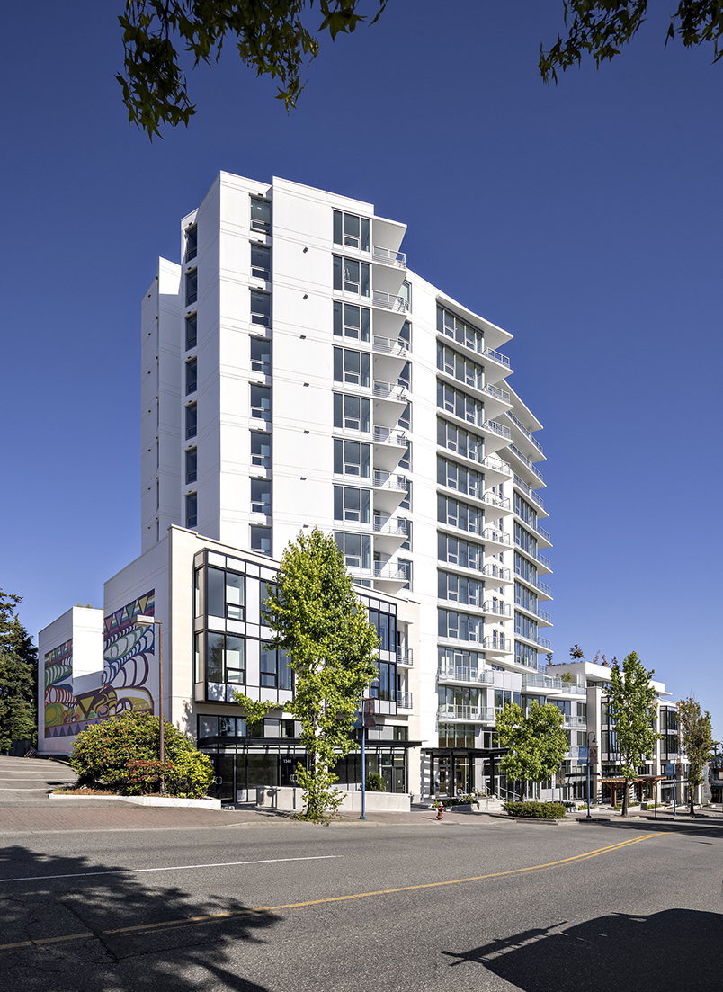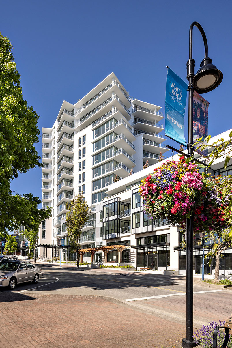 MONACO was designed in collaboration with PAUL MERRICK to embrace the views from the crest of the hill in White Rock’s Lower Johnston Road neighbourhood. MONACO is an elegant 13 storey mixed use project, with residential tower, and 4 level podium, with a total of 97 homes, and 7 commercial ground floor units with patio decks. Over 12,000SF of well-planned amenity space includes the rooftop community courtyard with community garden plots, a putting green, children’s play area, private dog run, a barbeque dining space, and a fireplace lounge. Then inside, residents can enjoy the fitness and yoga studio, kitchen & dining area, lounge, hobby room and pet spa.